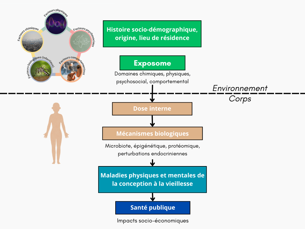 L’objectif final est de développer un cadre intégré analysant les relations entre les facteurs socio-territoriaux et l’exposome, en tenant compte des trois dimensions principales de l’exposition : physico-chimique, comportementale et psychosociale.
