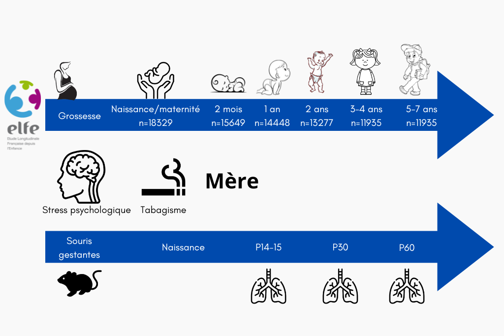 L’objectif principal de ce projet est d’évaluer les interactions entre le stress psychologique maternel et le tabagisme au cours des premières années de vie, et leurs conséquences sur la santé respiratoire des enfants. En raison de l’association entre le stress précoce et les comorbidités dépressives, ainsi que de la disponibilité des données dans la cohorte ELFE, le WP2 étudiera également les phénotypes dépressifs et anxieux chez les enfants comme résultats secondaires. Pour aborder la complexité des effets de ces deux facteurs, le WP2 adoptera une approche épidémiologique combinée et des modèles animaux, afin d’identifier les perturbations physiologiques et les mécanismes cellulaires sous-jacents.